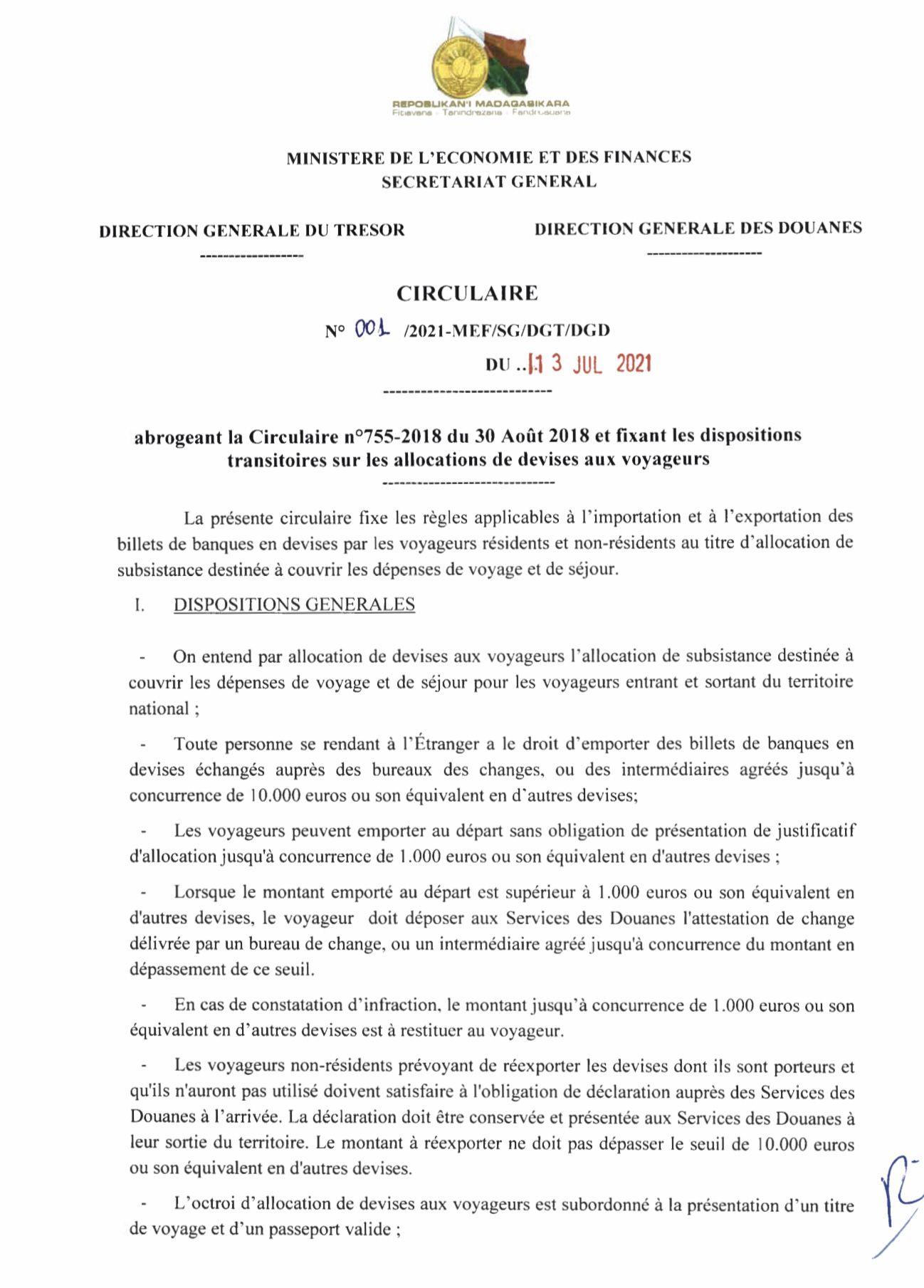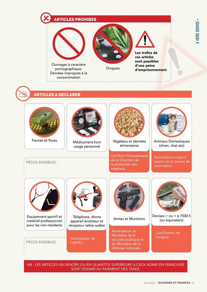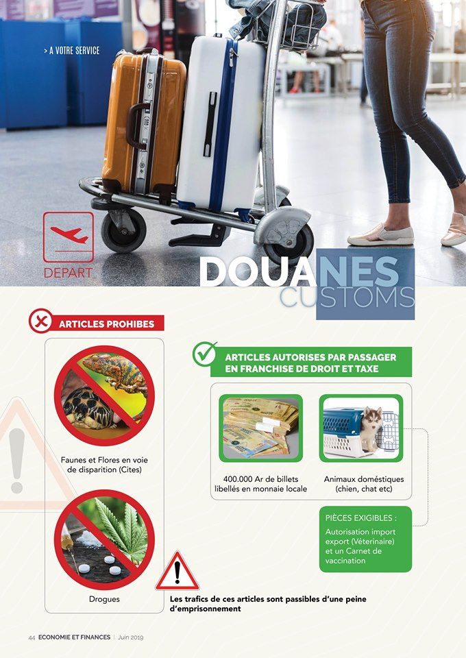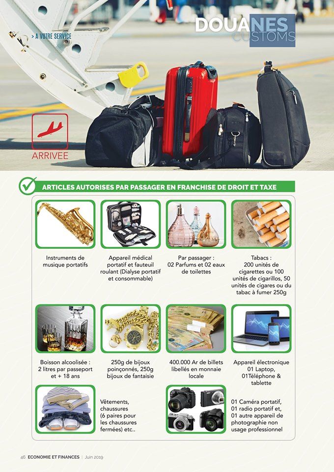 - Money : Up to €10,000 - see circular 001/2021-MEF/SG/DGT/DGD of 07/13/2021 400,000 ar of banknotes denominated in local currency - Tobacco: 1 carton of cigarettes or 100 units of cigarillos, 50 units of cigars or 250 grams of smoking tobacco. - Alcoholic drinks: 02 liters per passport (+18 years old) - Jewelry : 250 grams Hallmarked jewelry 250 grams Fashion jewelry - Perfumes: 2 perfumes and 2 toilet waters (per passenger) - Electronic device: : 01 Computer, 01 telephone, and 1 tablet (Maximum) - Other devices: 01 portable camera, 01 portable radio, and 01 other non-professional photography device - Clothes and shoes: 6 pairs maximum for closed shoes… portable musical instruments - Portable medical device and wheelchair - Portable and consumable dialysis