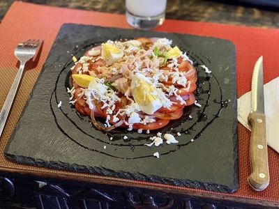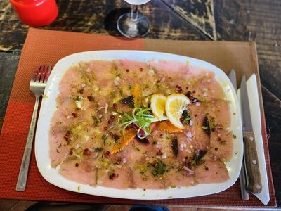Tuna carpaccio made with Red tuna, capers, gherkin, pink pepper, wild pepper, lemon, olive oil,