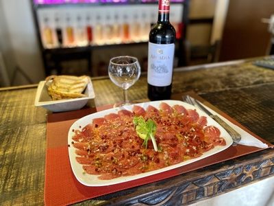 Zebu carpaccio made with capers, pickle, pink pepper, wild pepper, lemon, olive oil