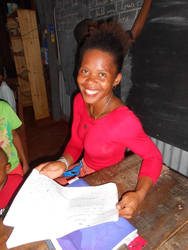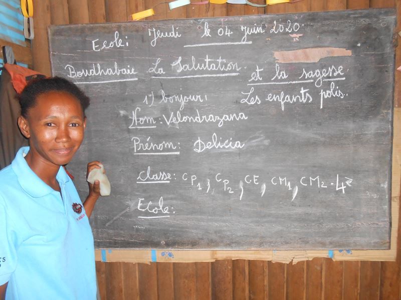 L’institutrice / monitrice habite le village même. Vozama la recrute, la forme en continu, aide à financer son indemnité et les fournitures… C’est elle qui accompagne les enfants, bien au-delà de l’acquisition des savoirs scolaires de base. C’est notre premier métier : il s’est élargi…